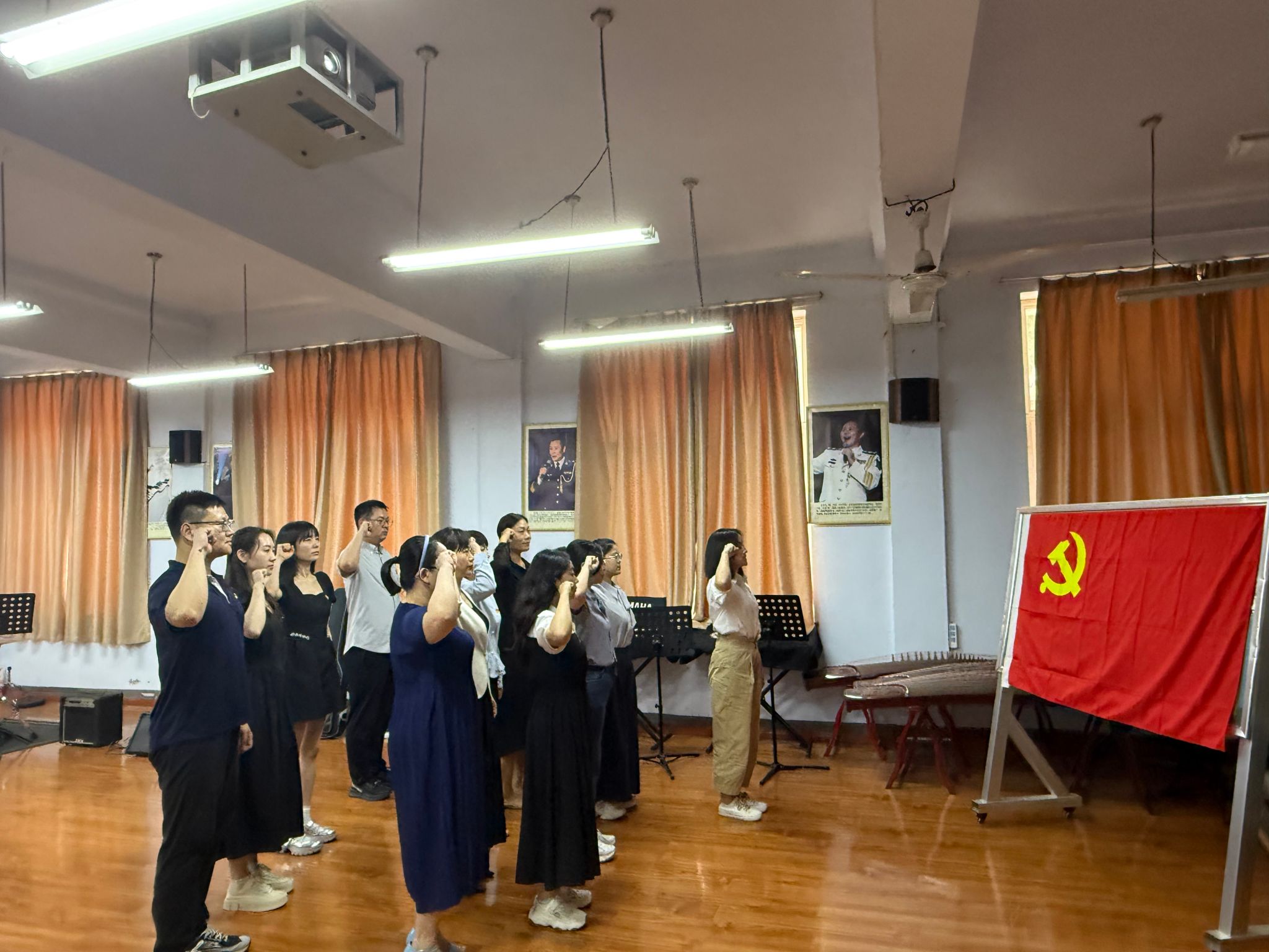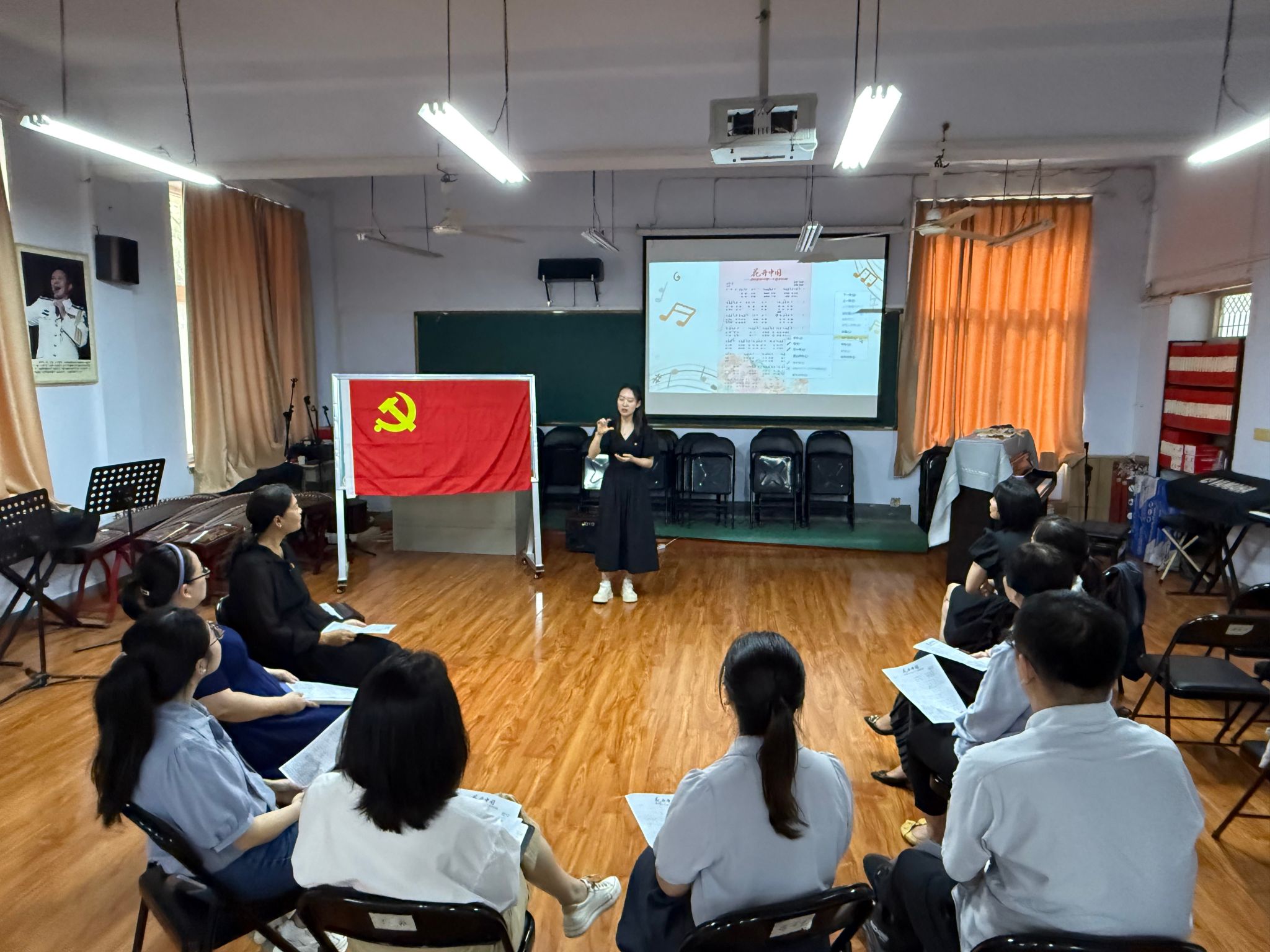 “再唱山歌给党听”环节,大家一同穿越时空,共同鉴赏了《保卫黄河》《社会主义好》《春天的故事》《领航新时代》四首承载着历史记忆与精神力量的经典红歌,让大家感受到了每一段旋律背后的时代故事与奋斗精神。随后,大家结合自身体会,畅所欲言,共话红歌背后的时代变迁与精神传承,在交流研讨中回望百年复兴路,深度挖掘红歌育人元素,为将红歌有机融入思政课堂提供了新思路。最后,艺术教学部直属党支部王稼嵘老师指导大家一起学唱了红歌《花开中国》,在优美的旋律和歌声中,唱出了对党的深情祝福,奏响了砥砺前行的坚定决心。