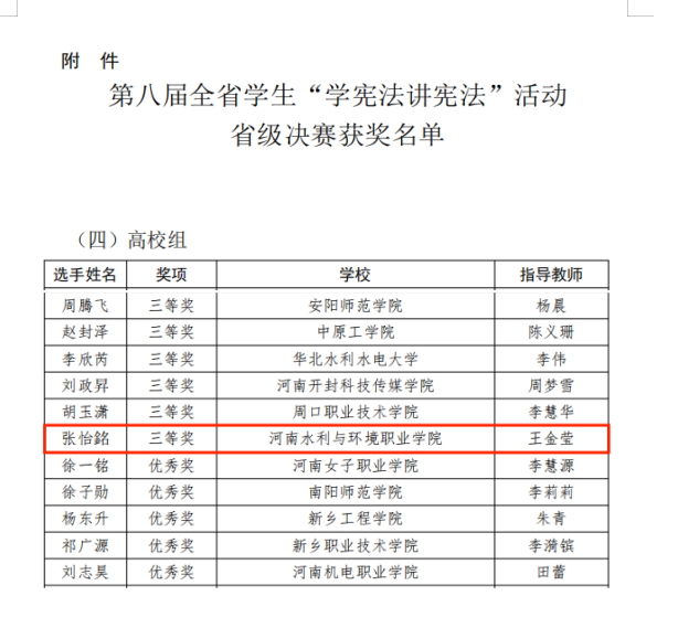 10月18日,河南省教育厅公布了第八届全省员工“学宪法 讲宪法”活动总决赛获奖名单,思政部选派的2022级水工3班员工张怡銘在比赛中获得三等奖的好成绩。